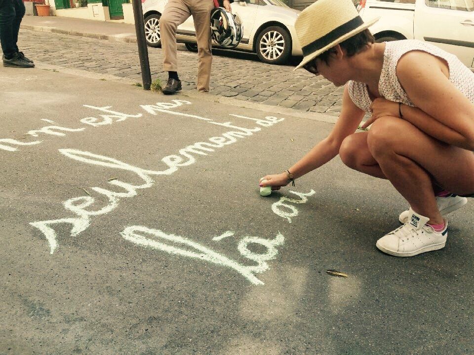 … y-a-t-il une chute plus douce ? Munie d'un bâton de craie, je perds l'espace d'un instant ma capacité à être adulte, je retrouve mon écriture d'enfant pour « craier » sur mon tableau noir, le bitume. Là, je joue avec les mots comme on joue avec des balles pour faire de la rue ma cour de récréation. Je lance mes aphorismes aux passants, puis à mes abonnées sur les réseaux sociaux. Ils les saisissent, les interprètent pour jouer à leur tour avec eux.